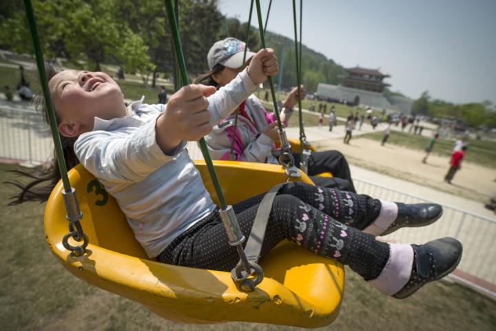 Un niño disfruta de un paseo en un parque de diversiones en Pyongyang.
