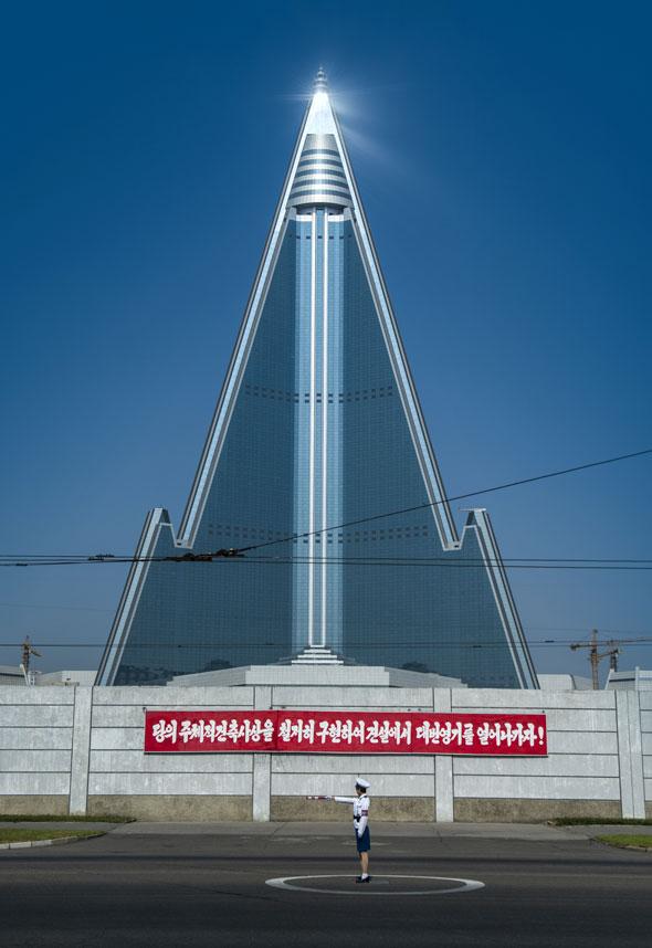 El Hotel Ryugyong en Pyongyang. Tiene 105 pisos. Su construcción tardó debido a que su diseño dificultó la colocación de los elevadores.