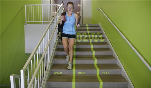 La estudiante Jody Nelson baja por los carriles verdes pintados en las escaleras del gimnasio. Foto de AP