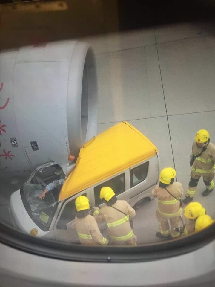 El extraño accidente tuvo lugar el pasado jueves, mientras se preparaba el vuelo KA691 para volar a Penang (Malasia). Las imágenes del incidente muestran a la camioneta desplazándose en línea recta hacia el lado del avión antes de desviarse a la derecha, al mismo tiempo que el avión se movía hacia la pista de aterrizaje.