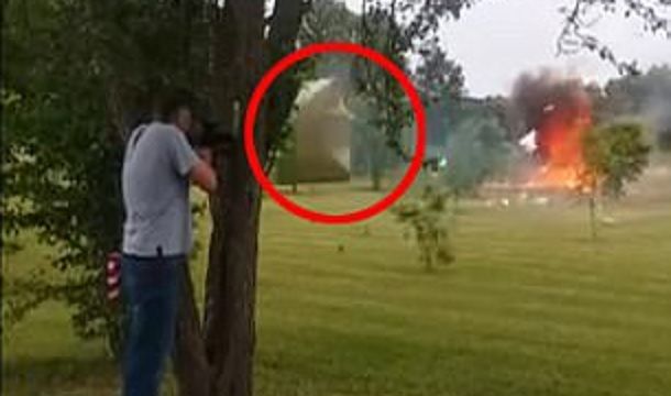 El hombre, quien se cubre detrás de un árbol, dispara contra la nevera, pero debido a la fuerza de la explosión la puerta sale disparada pasando a centímetros del tirador.