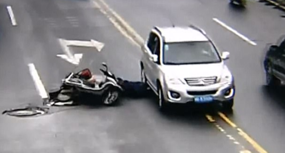 Este accidente tuvo lugar en Lanxi, provincia de Zhejiang y, de acuerdo con reportes de medios locales, el hombre perdió el control de su scooter por lo que se impactó contra una SUV.