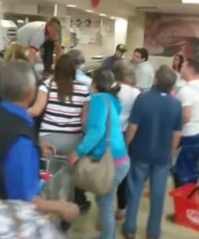 La crisis de alimentos en Venezuela se complica conforme pasan los días y para muestra estas imágenes difundidas en un video del momento en que un empleado de supermercado se lanza del mostrador contra un cliente.