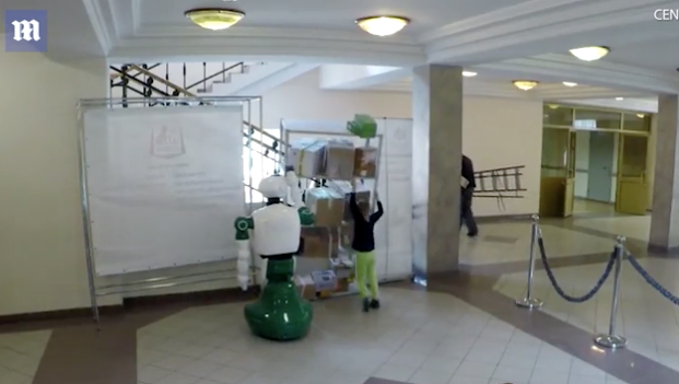 En un video difundido en internet se observa el momento en el que un robot ruso salva a una niña de ser aplastada por un estante con cajas.
