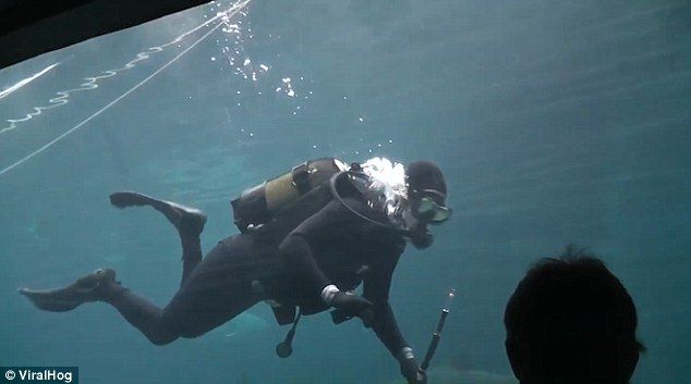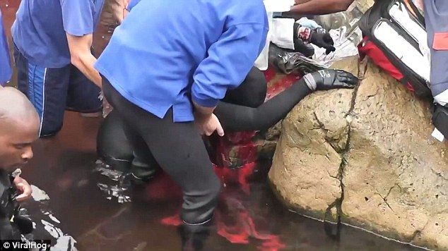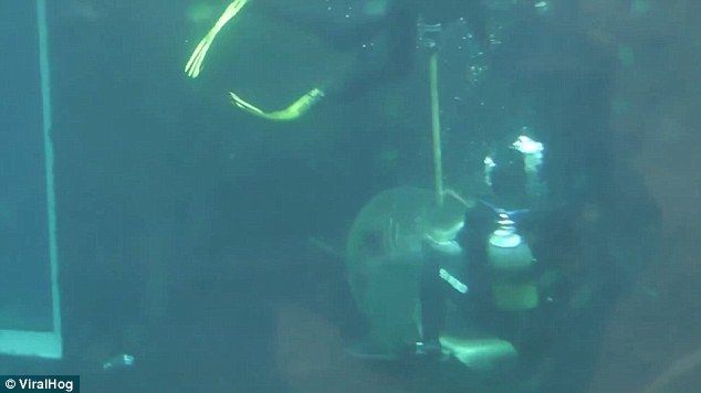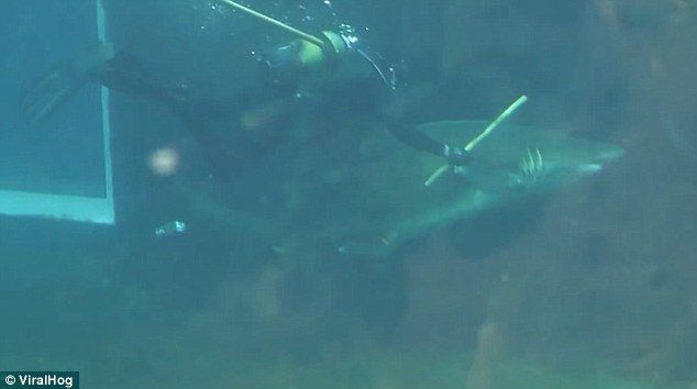 El video fue filmado por personal del acuario en Durban, Sudáfrica, y muestra el seguimiento del ataque del tiburón en el agua. El gran pez fue rodeado por dos hombres que aparecen para tratar de tranquilizarla con una jeringa.