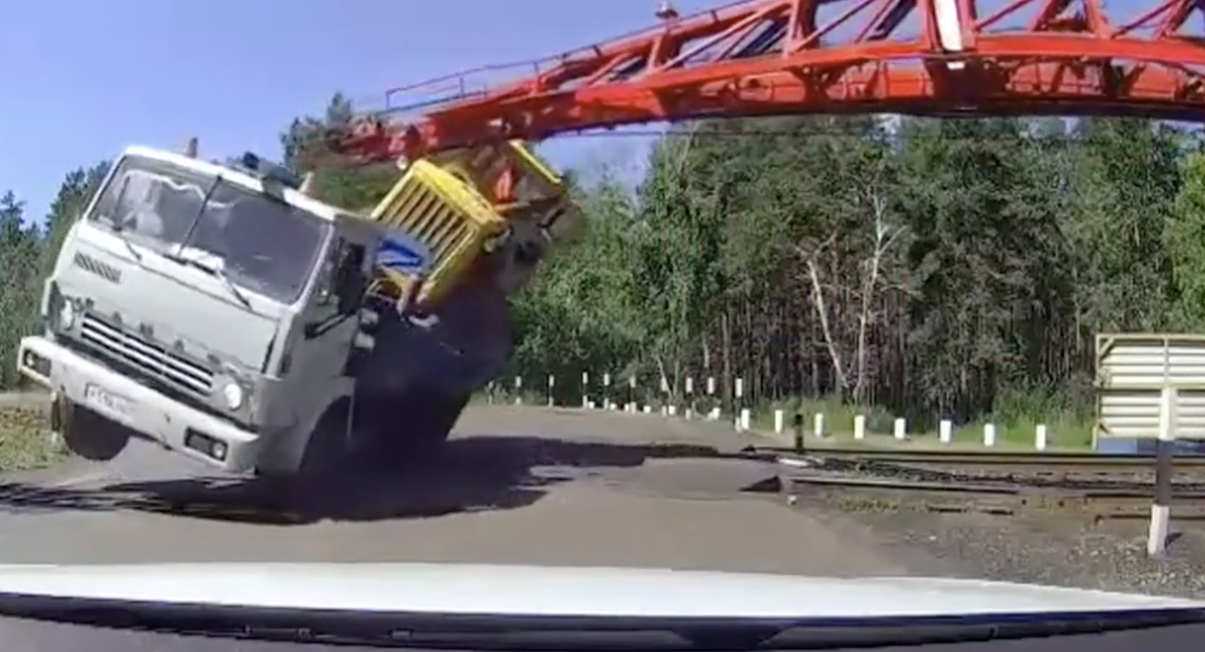 En Rusia, la impaciencia de un conductor hizo que su camión terminara volcado al ser golpeado por la estructura que cargaba un tren que cruzaba la avenida.