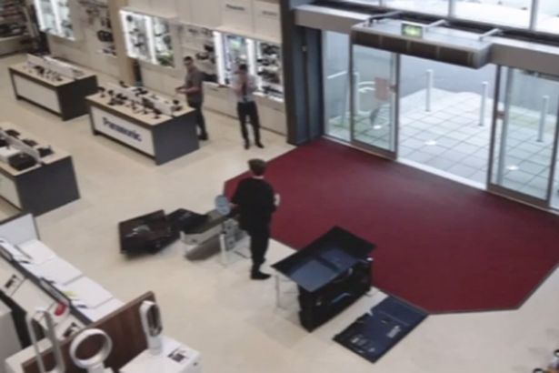 Las cámaras de una tienda captaron el divertido momento en que un cliente tira cuatro pantallas cuando trataba de revisar una de ellas