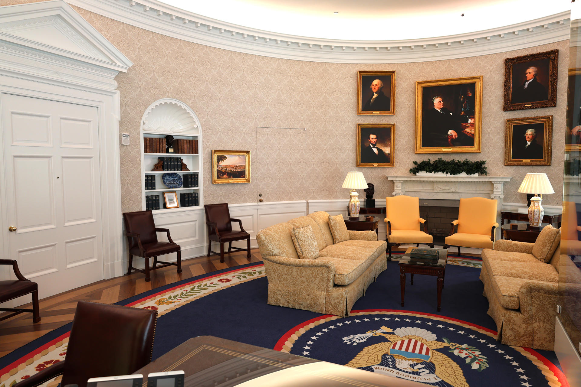 El escritorio Resolute, utilizado durante décadas por los presidentes, es una réplica que cuenta incluso con la pequeña puerta por la que se asomó el hijo de John F. Kennedy en una de las fotos más famosas del Despacho Oval.