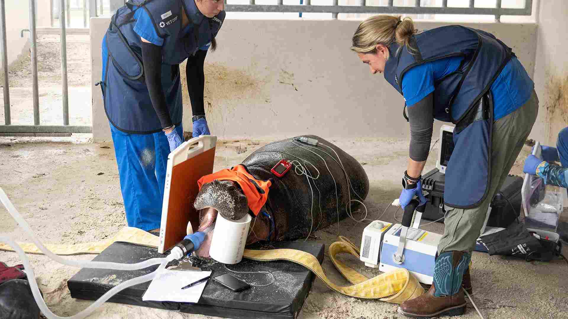 El hipopótamo macho recibió durante el examen del miércoles pruebas completas que incluyeron radiografías, exámenes de ultrasonido, endoscopia de los senos y análisis de sangre para evaluar su condición.