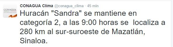 En su aviso de ciclón tropical, detalló que Sandra avanza hacia el nor-noroeste a una velocidad de 19 kilómetros por hora con vientos sostenidos de 160 kilómetros por hora y rachas de 180 kilómetros por hora.
