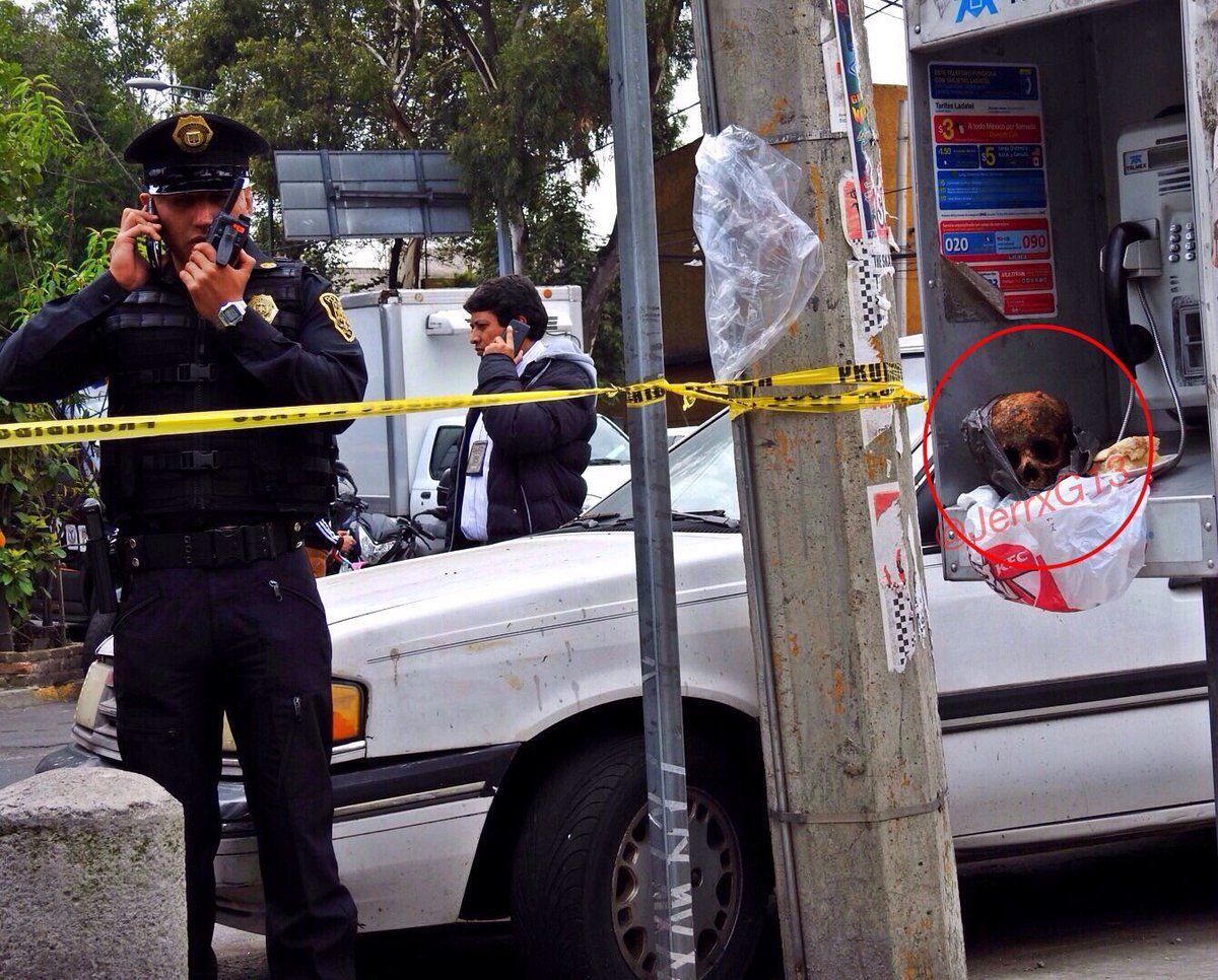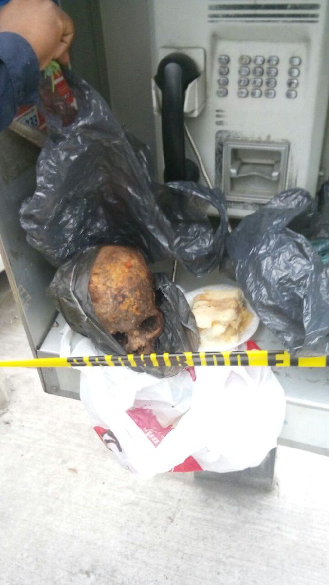 Vecinos avisaron a la policía de la existencia de un cráneo sobre un teléfono público de Teléfonos Mexicanos. Al llegar al lugar, encontraron el cráneo cubierto con una bolsa negra y con una rebanada de pastel a un lado.