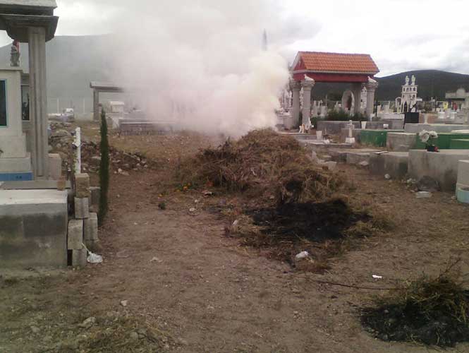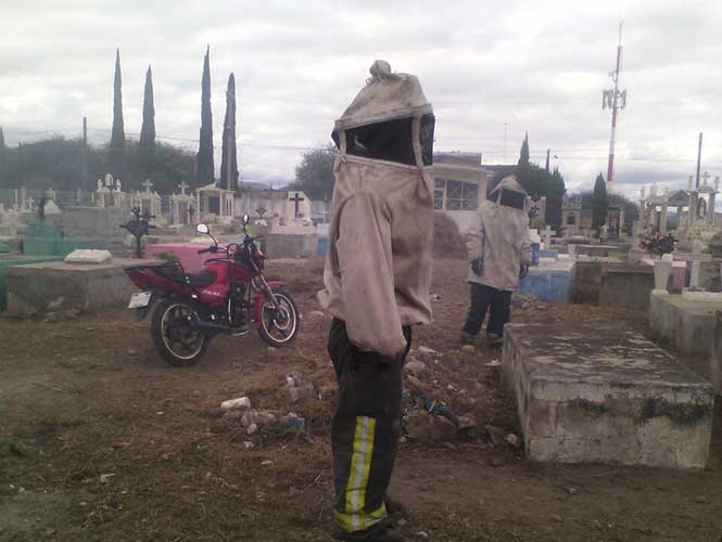 Los hechos se suscitaron esta mañana en el panteón ubicado en la manzana centro de Dios Padre cuando un grupo de personas realizaban tareas de limpieza; cuando pretendían limpiar una lápida, un enjambre comenzó a salir y picó a los vecinos de las diferentes manzanas.