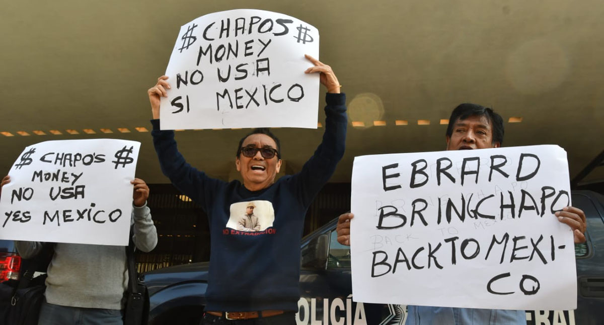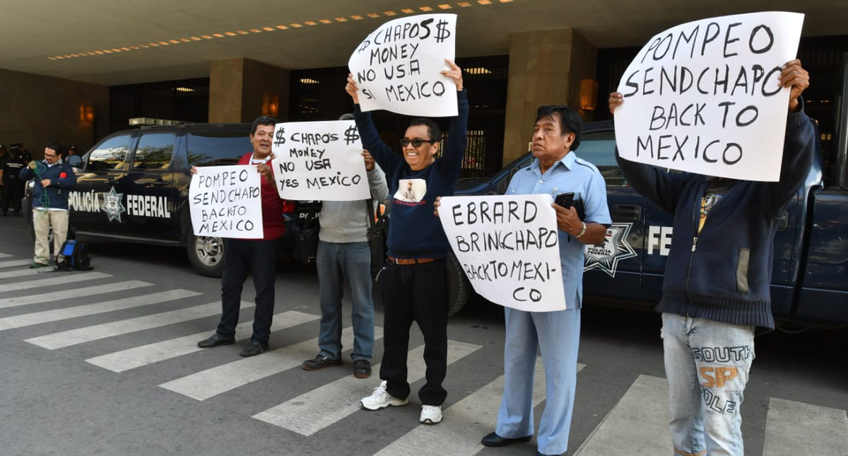 En las pancartas con las que esperaban al secretario de Estado de Estados Unidos, Mike Pompeo, y a funcionarios mexicanos se leía: “Pompeo send Chapo back to México” y “$Chapos$ money no Usa, sí México”.