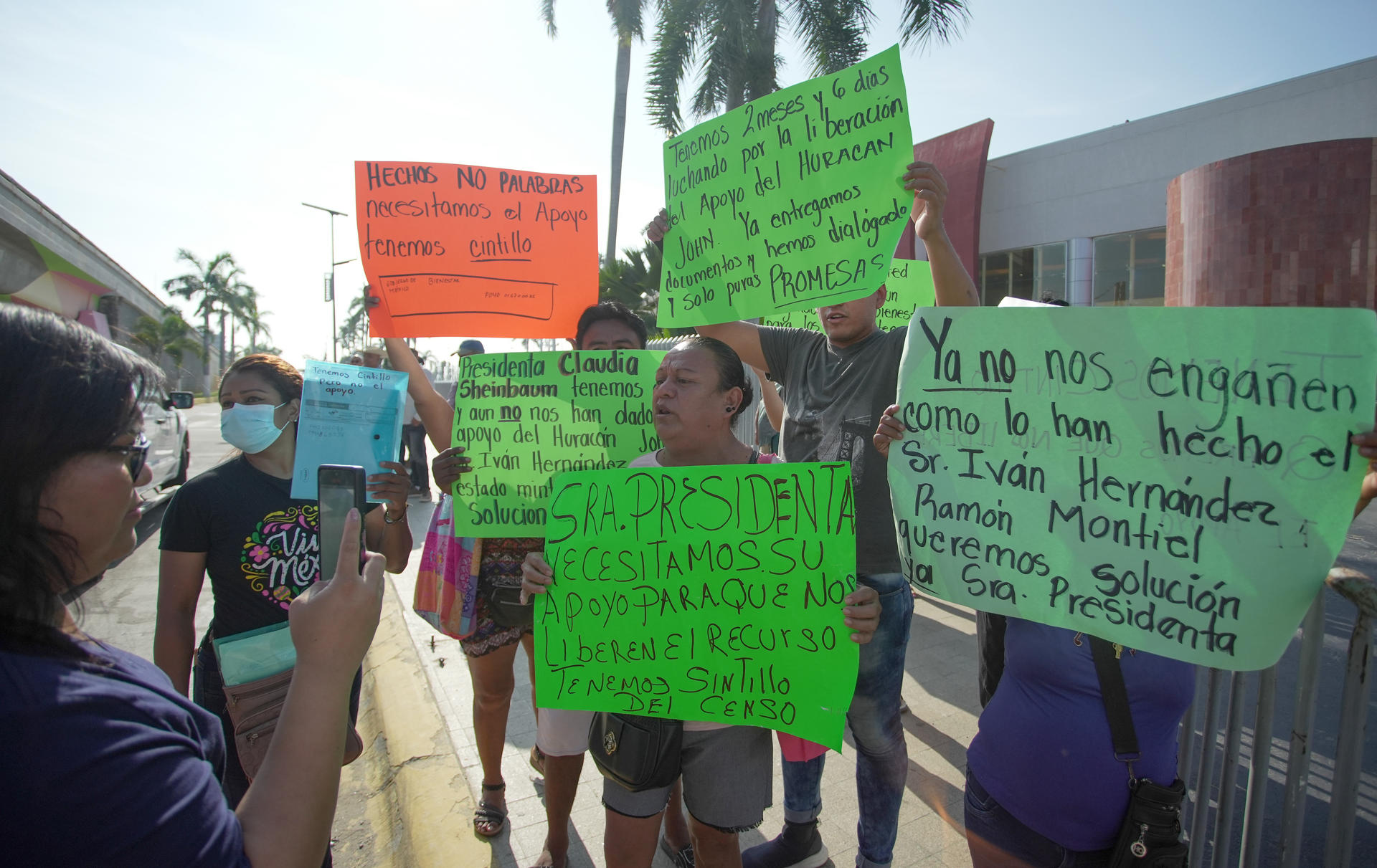 Cerca de 80 manifestantes, incluyendo algunos damnificados del huracán John que golpeó en septiembre, esperaron el arribo de la mandataria en el Fórum Mundo Imperial, sede de la sesión, con lonas, fotografías de los desaparecidos y cartulinas para pedir apoyo de los censos del Gobierno.
