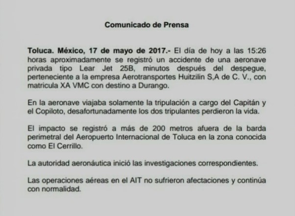 Aerolíneas Ejecutivas S.A. de C.V. lamenta mucho el accidente del avión Learjet 25B, matrícula XA-VMC, modelo 1973, sucedido el día de hoy en el Aeropuerto de Toluca, y que está registrado a nombre de la empresa Aerotransportes Huitzilin SA de CV y aclara que dicha aeronave NO PERTENECE a nuestra empresa ni tenemos relación alguna con dicha aeronave como algunos medios han erróneamente citado.