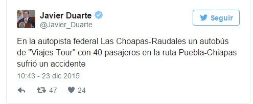 El gobernador de Veracruz, Javier Duarte, informó del incidente en su cuenta de Twitter.