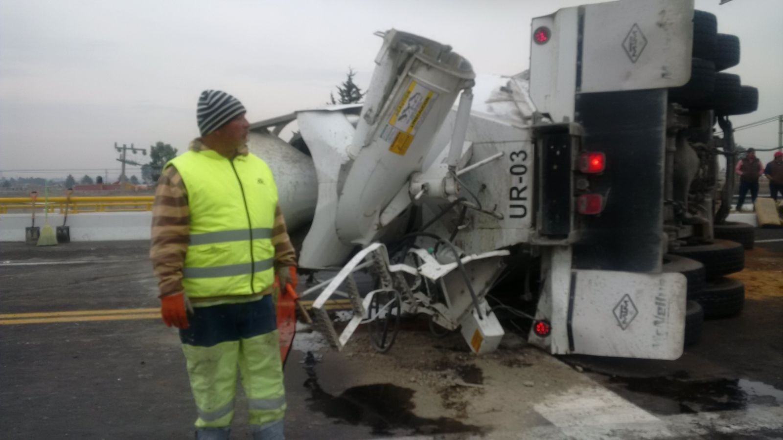 Debido al choque, el camión de construcción volcó y perdió parte del cabina al estrellarse contra el pavimento.