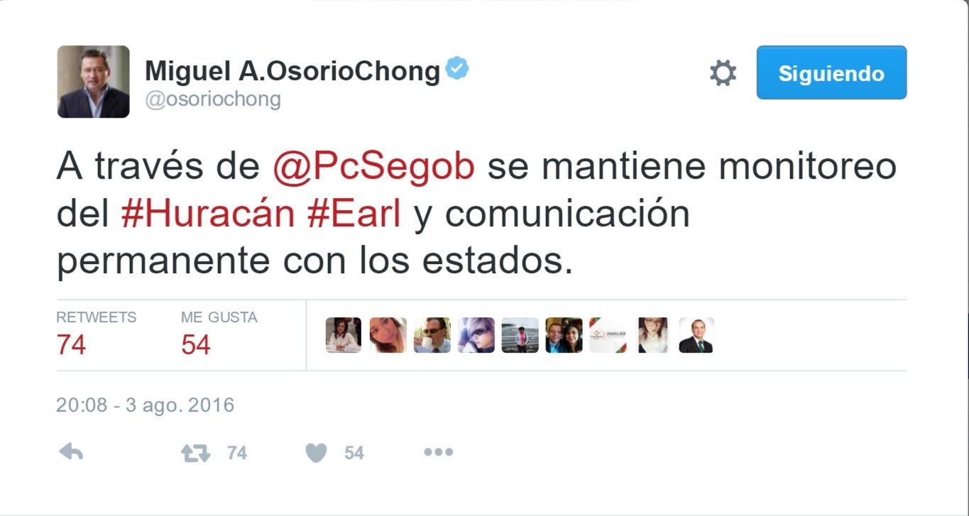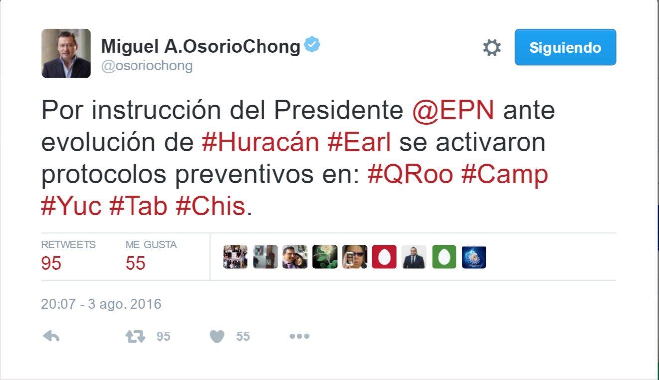“A través de @PcSegob se mantiene monitoreo del #Huracán #Earl y comunicación permanente con los estados”, destacó Osorio Chong en otro tuit en la red social.