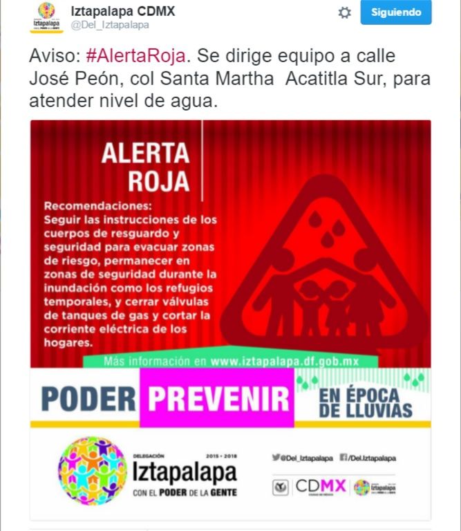 Las fuertes lluvias de esta tarde en la zona oriente de la Ciudad de México han provocado que las autoridades de Protección Civil decretaran en la delegación Iztapalapa la Alerta Roja derivado de las inundaciones y encharcamientos ocurridos en diversas zonas de la demarcación.