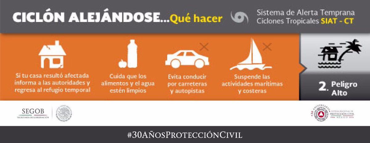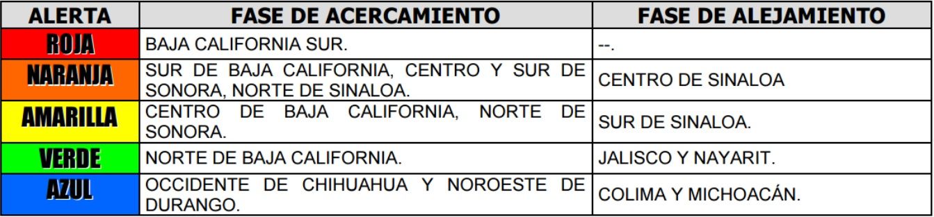 De acuerdo con un comunicado, con Fase Naranja se debe notificar a autoridades de la alerta, se debe procurar el resguardo de autoridades y población, así como la sesión permanente de los consejos estatales y municipales de Protección Civil, así como de las instancias de coordinación, comunicación e información de la trayectoria de los efectos del fenómeno y la necesidad de permanecer bajo resguardo.