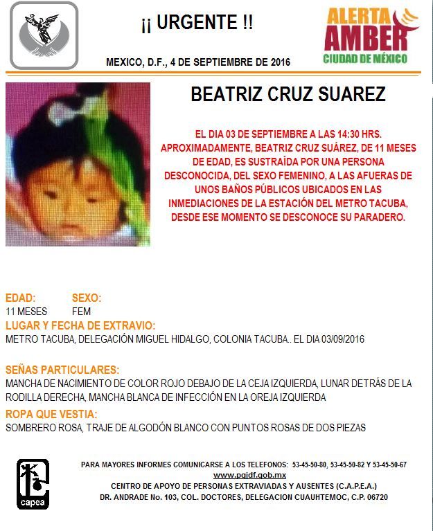 La Procuraduría General de Justicia capitalina activó la Alerta Amber para localizar a Beatriz Cruz Suárez, de 11 meses de edad, quien fue sustraída por una mujer desconocida afuera de unos baños públicos ubicados en inmediaciones de la estación del Metro Tacuba, delegación Miguel Hidalgo.