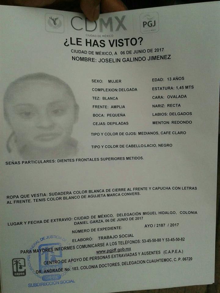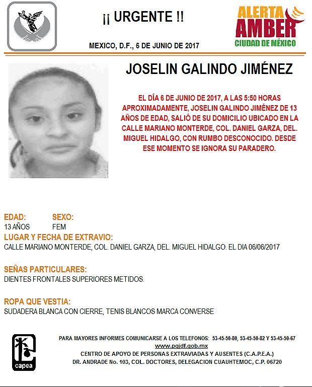 La Procuraduría General de Justicia de la Ciudad de México activó una Alerta Amber por la desaparición de la menor Joselín Galindo Jiménez de 13 años quien fue reportada como desaparecida por su padre, el fotoperiodista Víctor Galindo.