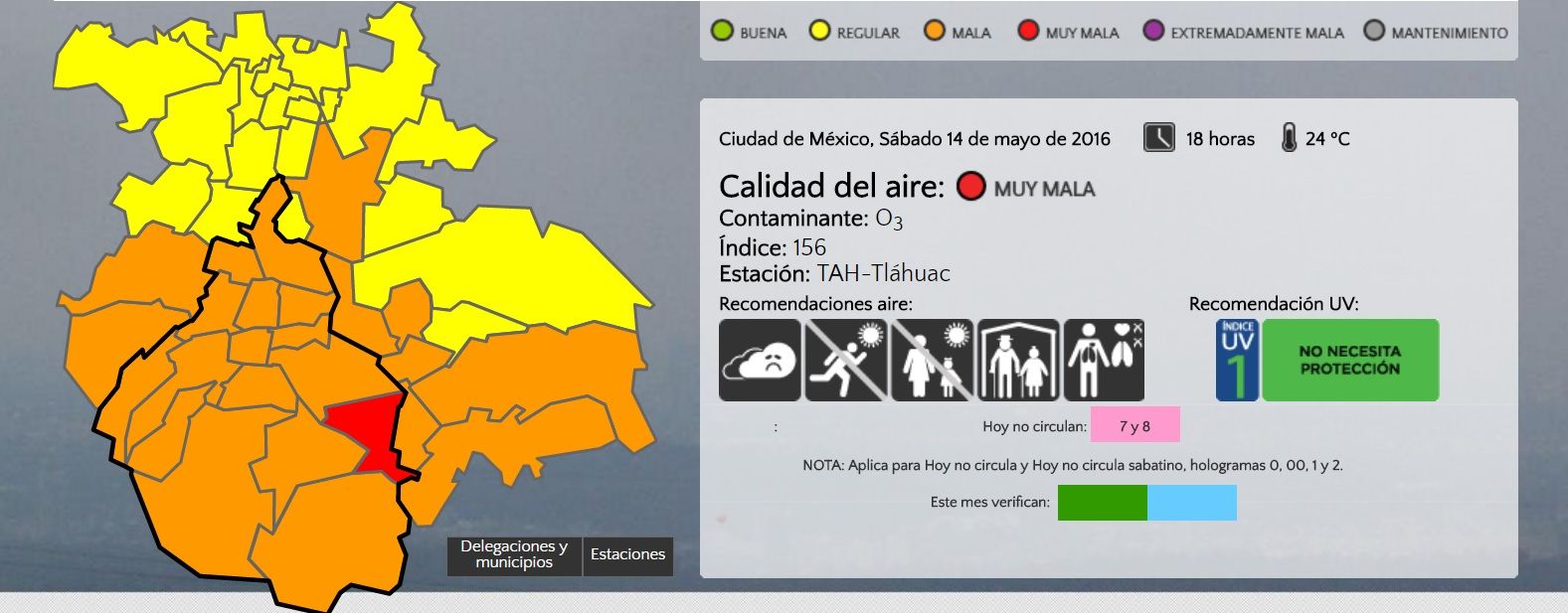 La Comisión Ambiental de la Megalópolis informa que el sistema de alta presión que ha permanecido sobre el centro del país se intensificó durante el día, incrementando la estabilidad atmosférica, condición que permitió una escasa dispersión de los contaminantes, lo cual, en presencia de la radiación solar favoreció la actividad fotoquímica en la atmósfera. Durante la tarde se ha observado un arrastre continuo de los contaminantes hacia el sureste de la zona metropolitana lo que ha provocado que a las 17:00 horas se registre una concentración máxima de 157 puntos (161 ppb) en el índice de calidad del aire en la estación Tláhuac (TAH), ubicada en la delegación del mismo nombre, en la Ciudad de México. Para el resto de la tarde se observará una lenta pero gradual dispersión de los contaminantes. Por lo anterior se ACTIVA la FASE I DE CONTINGENCIA AMBIENTAL ATMOSFÉRICA POR OZONO.