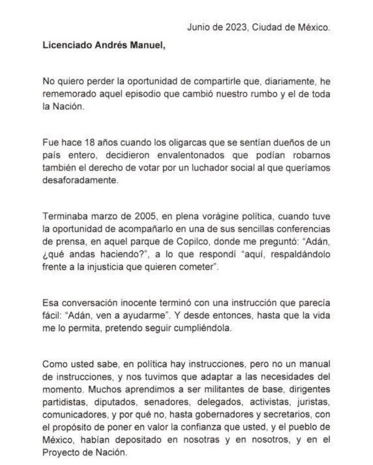 En su misiva, Adán Augusto López aclaró que en su lucha por la Presidencia de la República no busca “algo mejor o más grande” que el privilegio de acompañar a López Obrador.