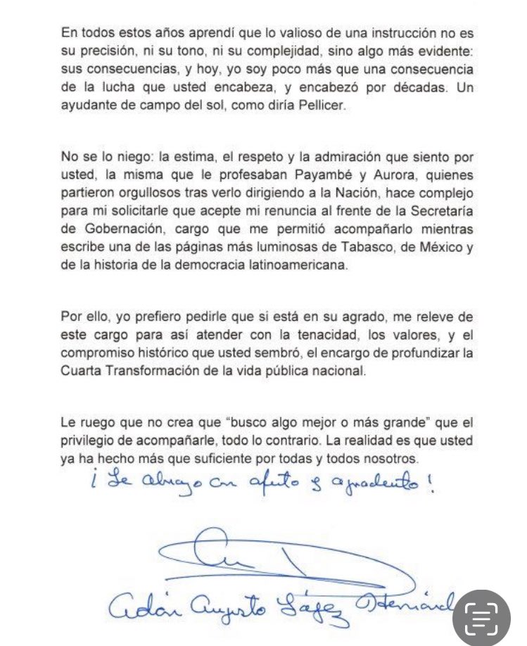 Adán Augusto López argumentó complejidad en renunciar, por lo que pidió al presidente López Obrador que lo releve de la Segob