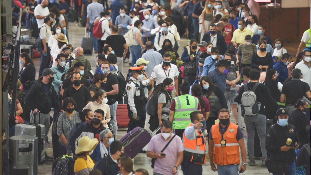 Al iniciar las vacaciones por Semana Santa, cientos de personas se congregaron en la Terminal 1 del Aeropuerto Internacional de la Ciudad de México (AICM), a pesar del riesgo de una tercera ola de la pandemia de COVID-19 y del Semáforo Naranja en la capital.