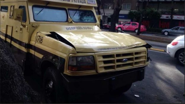 La zona fue acordonada y tuvieron que cerrarse dos carriles de Insurgentes, debido a que el camión quedó impactado contra un árbol; en tanto personal de la empresa Cometra realiza el traspaso de valores a otro vehículo.