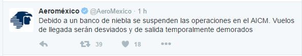 “Debido a un banco de niebla se suspenden las operaciones en el AICM. Vuelos de llegada serán desviados y de salida temporalmente demorados”, indicó en su cuenta @AeroMexico.