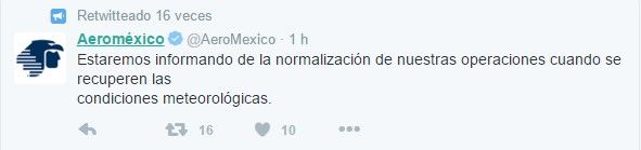Aeroméxico también informó que los vuelos de llegada serían desviados y los de salida temporalmente demorados, pero el mejoramiento de las condiciones climáticas permitieron normalizar sus actividades.