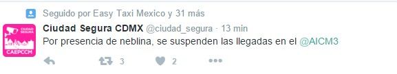 “Por presencia de neblina en el AICM, se suspenden entradas y salidas.”, dio a conocer el organismo en su cuenta de Twitter @ciudad_segura.