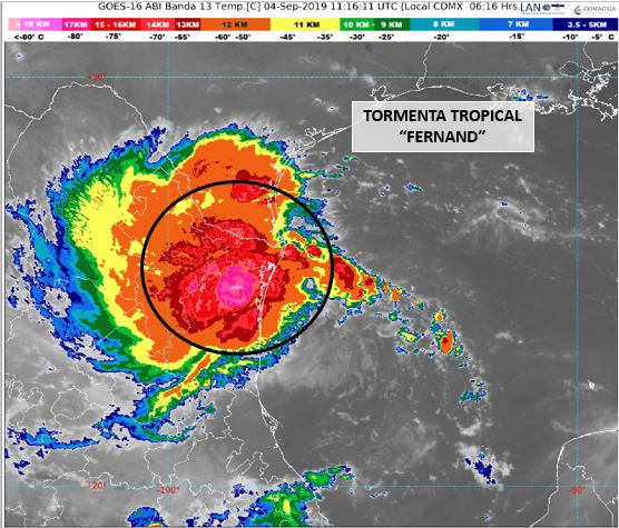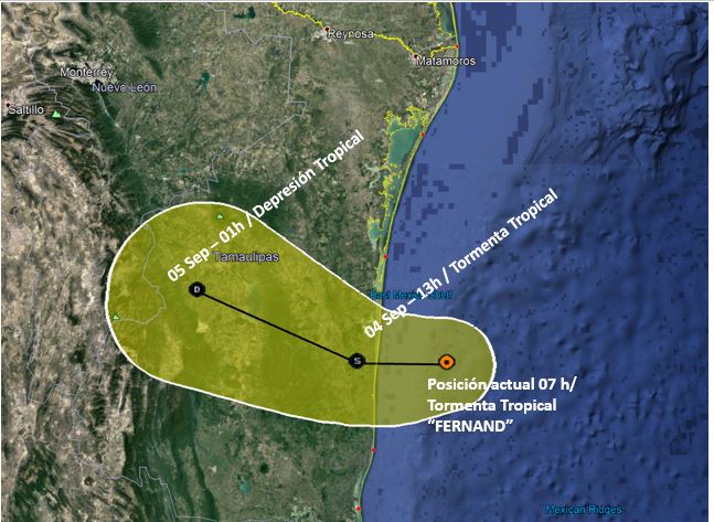 La tormenta tropical Fernand se aproximará a la costa central de Tamaulipas; el centro del sistema ingrese a tierra durante esta mañana, causando lluvias torrenciales