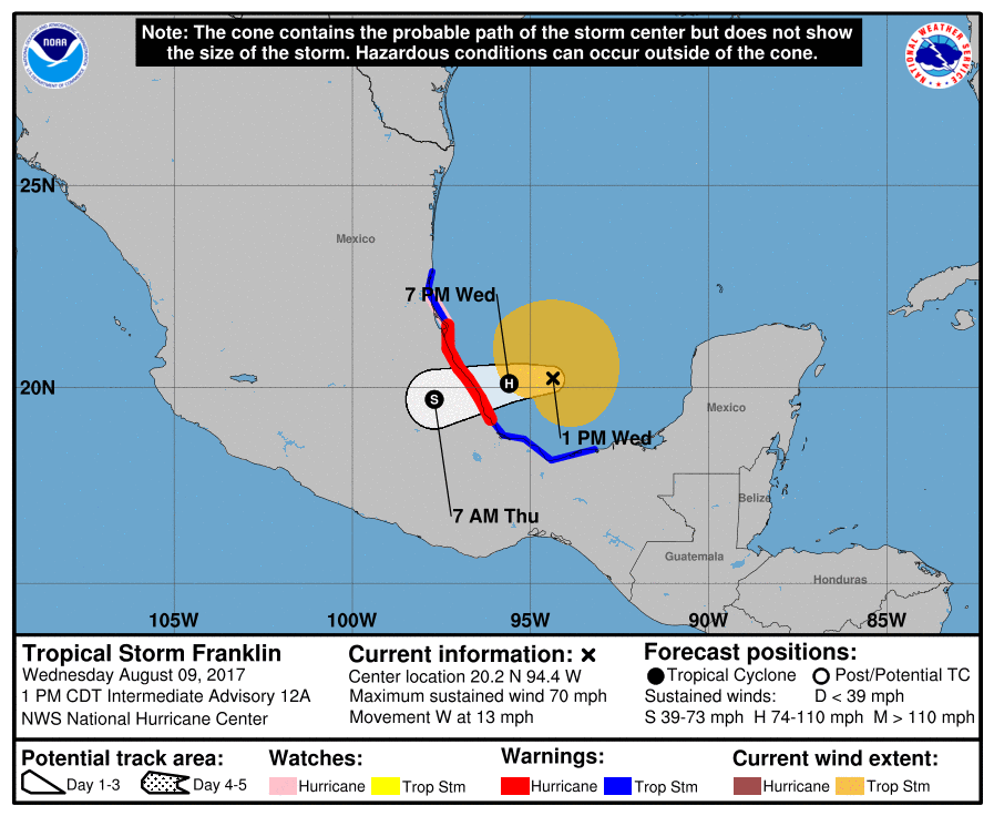 Resaltó que Franklin se localiza en estos momentos a 200 kilómetros al este-noreste de Veracruz; se desplaza en dirección oeste a una velocidad de 20 kilómetros por hora hacia esa misma entidad.