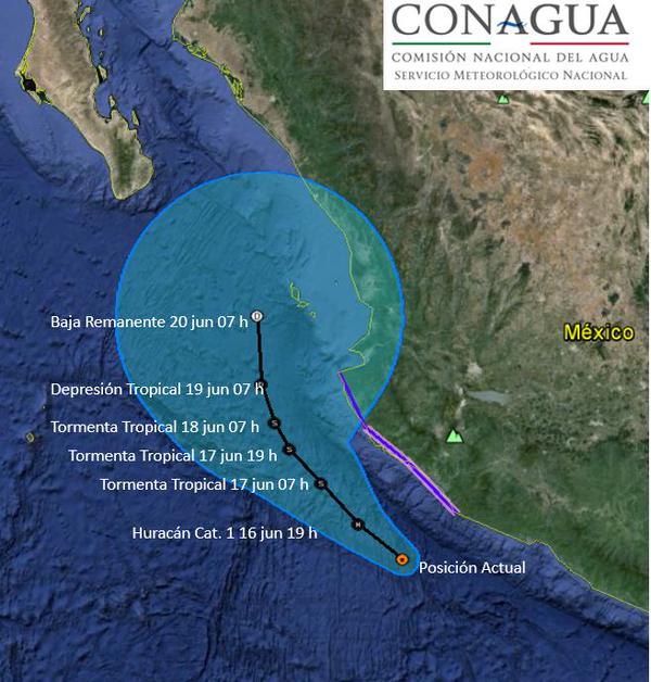 Para las 13:00 h se prevé que el meteoro se localice sobre el mar a 155 kilómetros por hora al oeste-suroeste de Punta San Telmo, en Michoacán, y a 140 kilómetros al sur de Manzanillo, Colima.