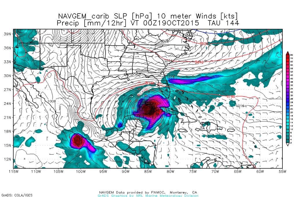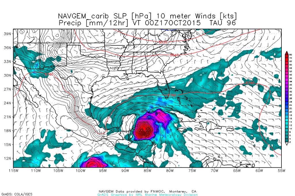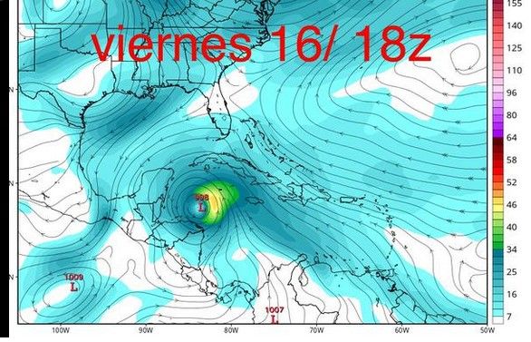 En esta secuencia se muestra el pronóstico para el 18 y 19 de octubre donde una tormenta tropical estará entrando a las costas del estado de Guerrero y Michoacán; así como un ciclón tropical cruzando el canal de Yucatán.