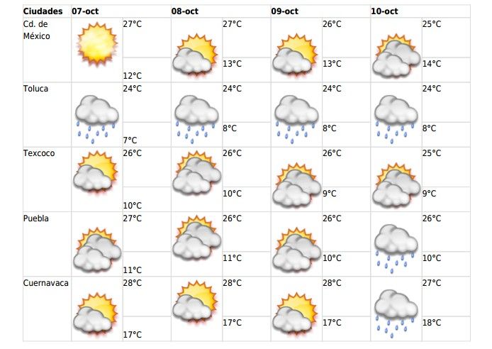 En tanto que los estados de Baja California Sur, Tamaulipas, Sinaloa, Nayarit, Michoacán, Guerrero, Oaxaca, Chiapas, Campeche y Quintana Roo mantendrán temperaturas de 35 a 40 grados centígrados.