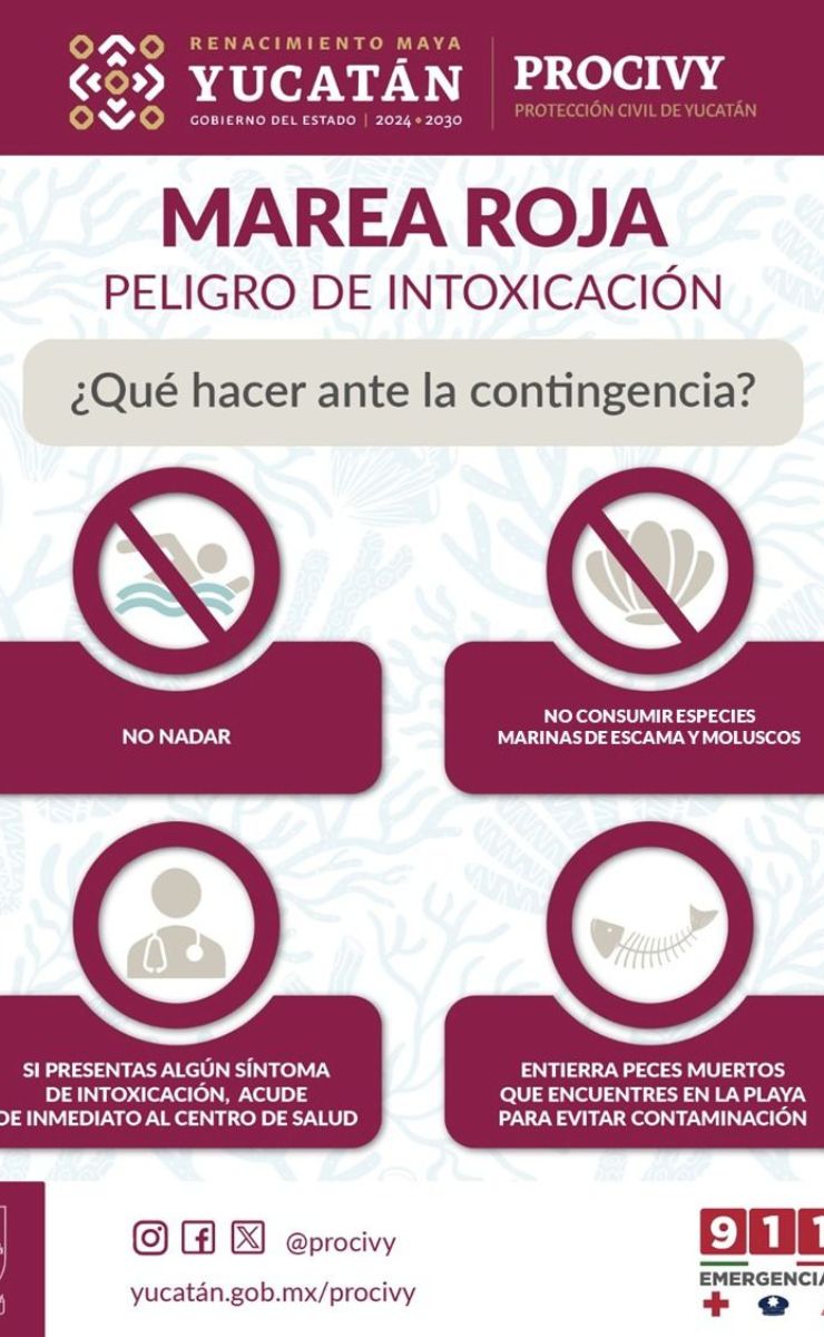 La Marea Roja, advirtió la Subsecretaría de Protección contra Riesgos Sanitarios de la Secretaría de Salud de Yucatán, es de alta toxicidad por las algas que causan el fenómeno.