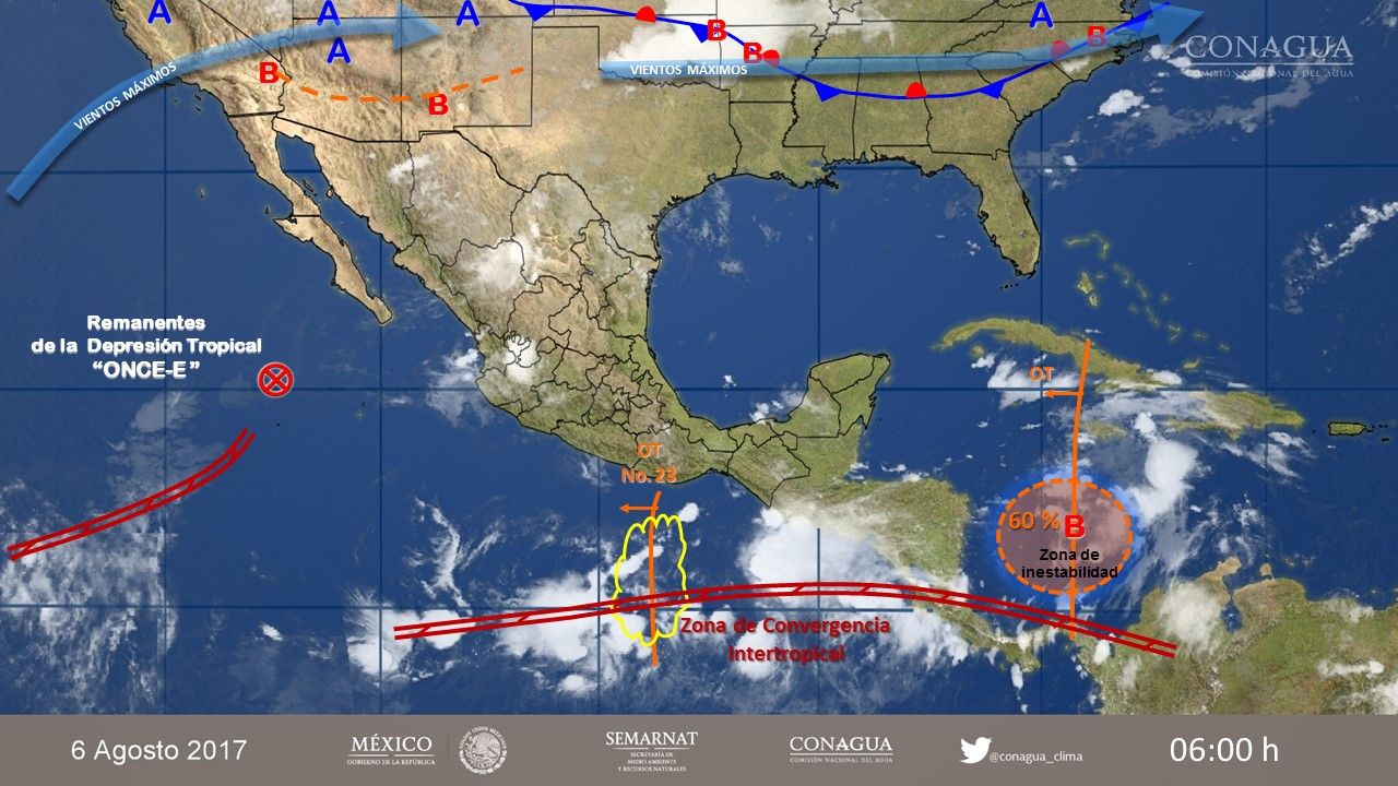 Además de desarrollo de zonas de tormenta durante la tarde, con actividad eléctrica y viento fuerte, debido a la onda tropical 23 que se localizará al sur de Colima y Jalisco y por un canal de baja presión sobre el norte y centro del país.
