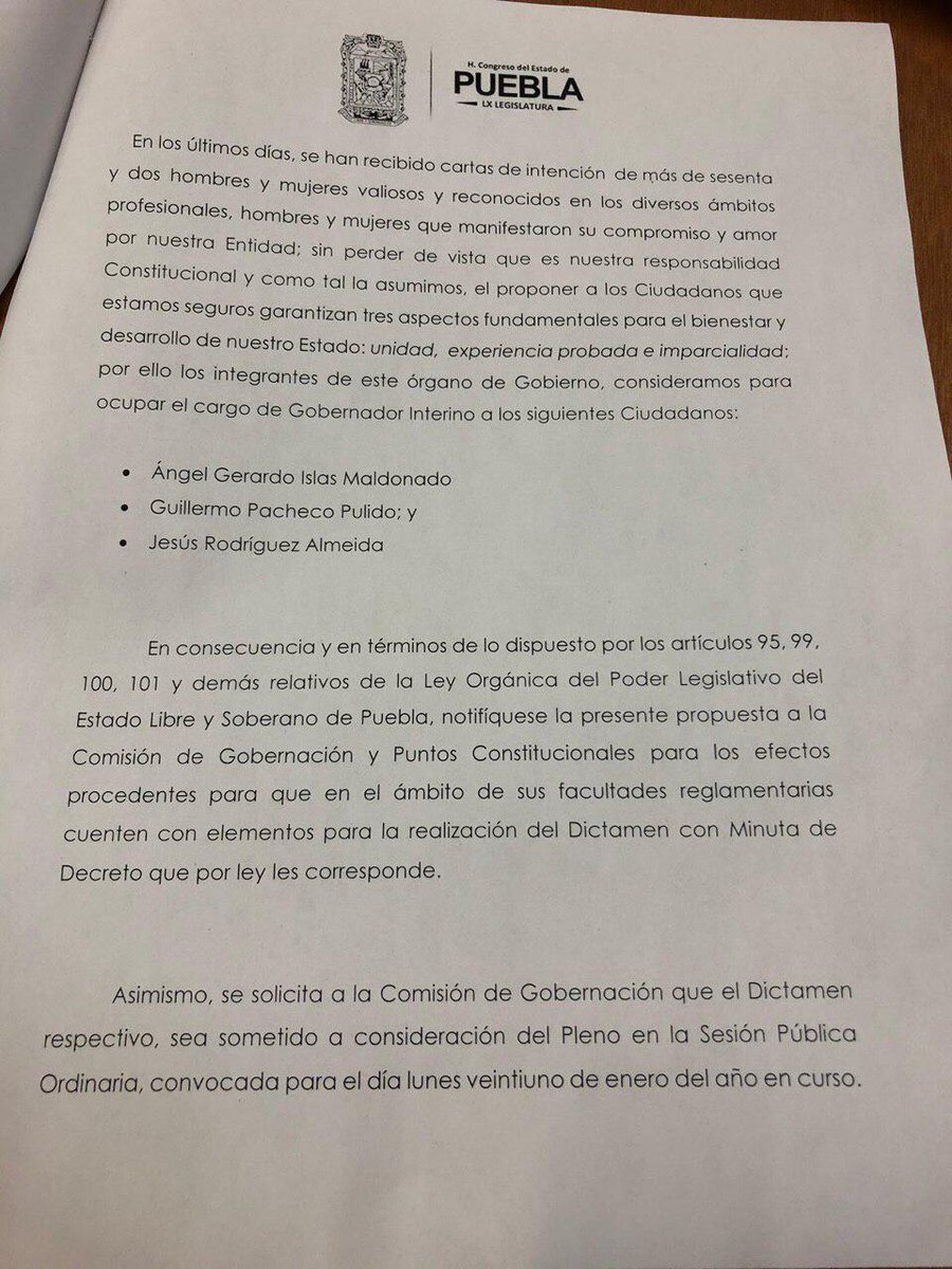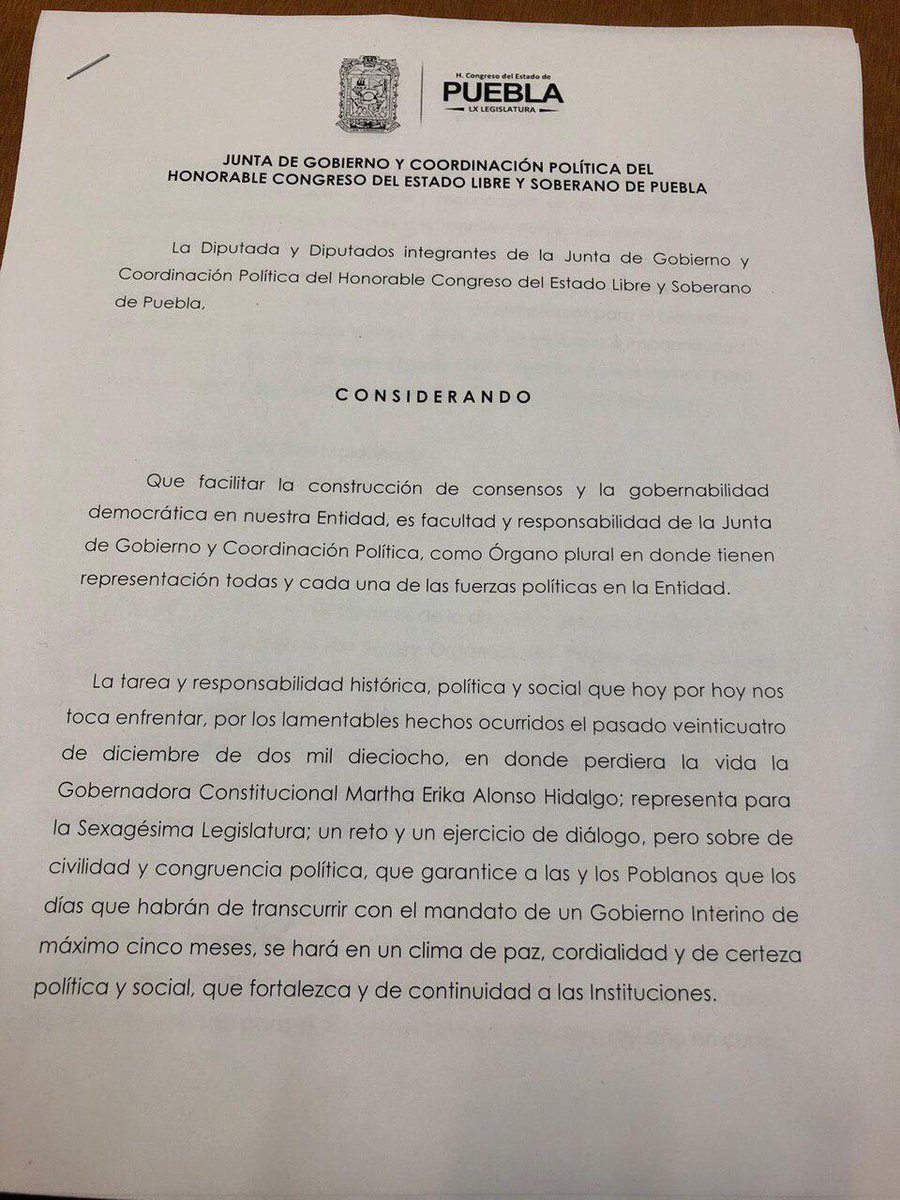 La Junta de Gobierno y Coordinación Política del Congreso de Puebla aprobó la terna que será llevada a la sesión del pleno del órgano legislativo este lunes para elegir al gobernador interino en sustitución de Martha Erika Alonso, quien murió el pasado 24 de diciembre junto a su esposo, Rafael Moreno Valle, en un accidente aéreo.