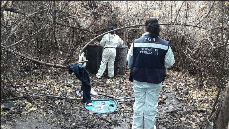 Detalló que en el lugar fueron localizados diversos objetos, como 11 bidones de plástico de 20 litros, 10 bidones más de 50 litros, 68 costales de 25 kilogramos, 25 tambos de plástico de 200 litros, 30 tambos metálicos de 200 litros, y un tambo metálico de 60 litros.