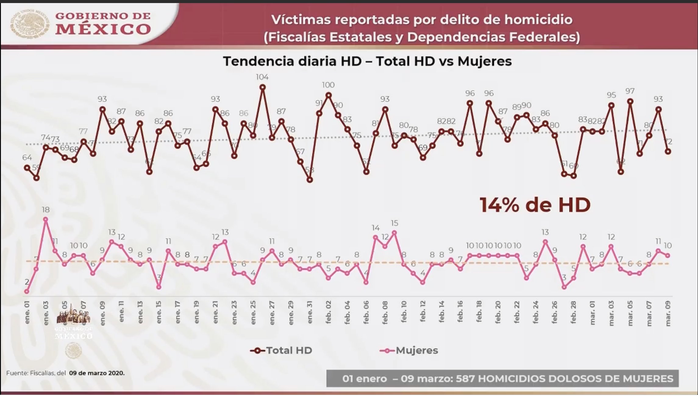 El presidente mostró una gráfica de la tendencia diaria de homicidios dolosos, en la que se señala que en durante el paro #UnDíaSinNosotras fueron asesinadas 10 mujeres.