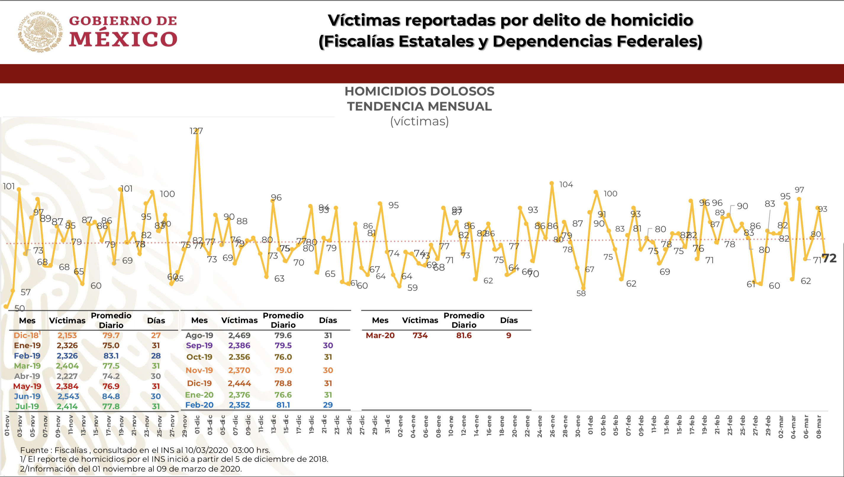 De acuerdo con datos de la Comisión Nacional de Seguridad, este lunes 9 de marzo fueron registrados en las Fiscalías estatales 72 homicidios dolosos en el país, por lo que presumió que México vivió un día con menos asesinatos, pues el 8 de marzo ocurrieron 93 asesinatos y 80 el pasado 7 de marzo.