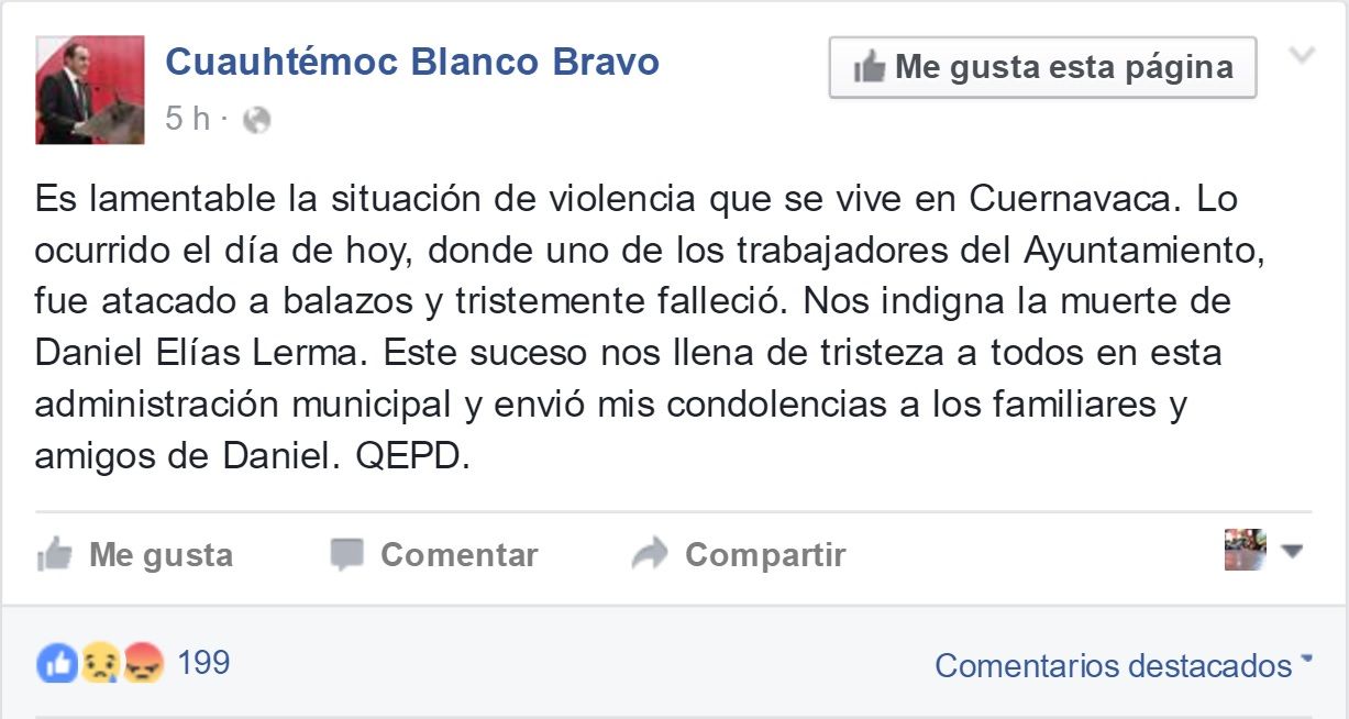 En tanto, el presidente municipal de Cuernavaca, el exfutbolista Cuauhtémoc Blanco Bravo, a través de su cuenta de Facebook condenó los hechos, señalando sentirse afligido y solidario con la familia de Elías Lerma, quien llevaba laborando en el servicio desde hace diez años.