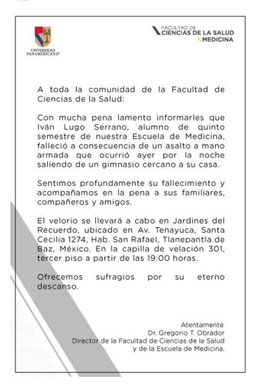 Gregorio Obrador, director de la Facultad de Ciencias de la Salud de la UP, informó que el hecho ocurrió cuando el alumno, identificado como Iván Lugo Serrano, salía de un gimnasio cercano a su domicilio.