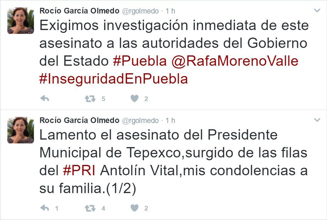 Por su parte, Rocío García Olmedo, secretaria General del PRI en el estado de Puebla, lamentó el asesinato y publicó un par de mensajes a través de su cuenta de Twitter.