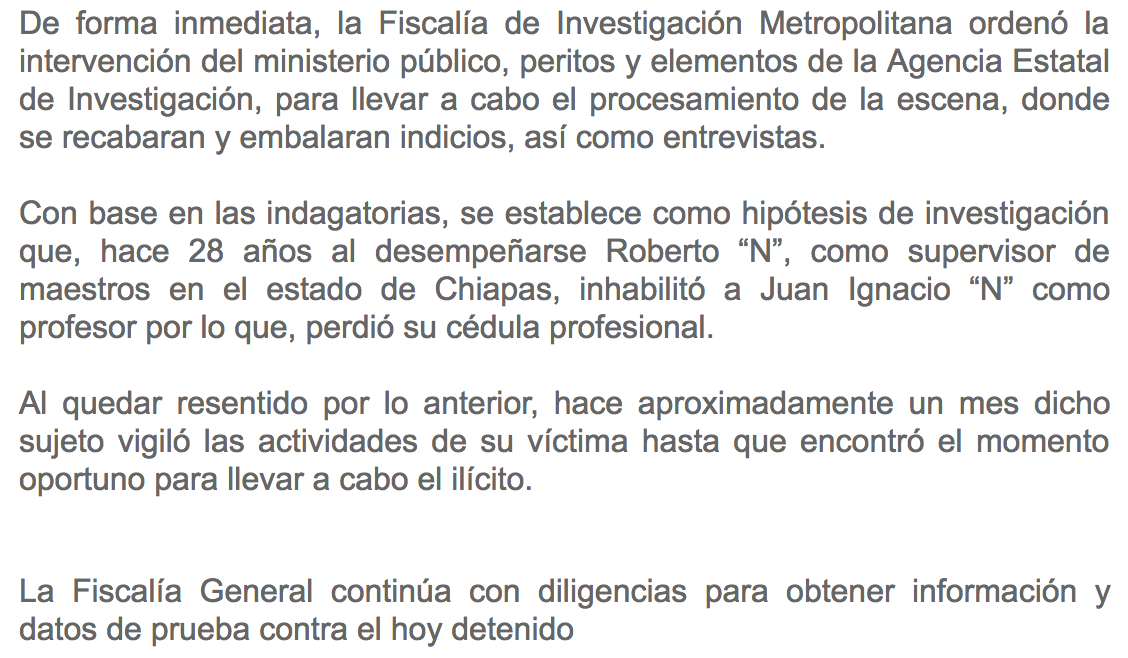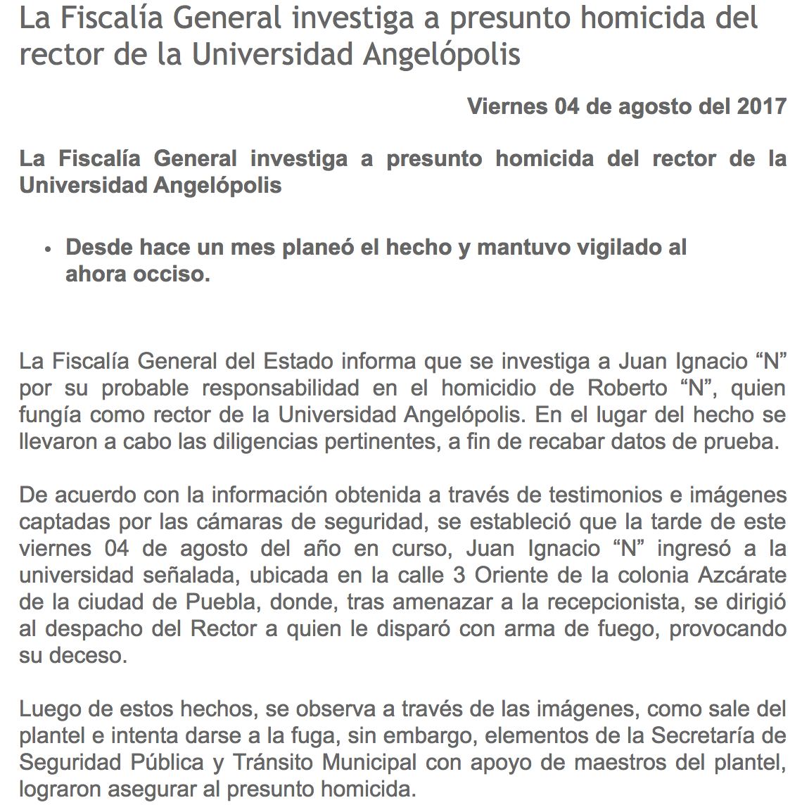Por su parte, Víctor Carrancá, el Fiscal General de Puebla, informó en Foro TV que el presunto agresor, mismo que fue detenido, “ya conocía (al rector) desde hace años por un problema familiar y por ello lo privó de la vida. Aparentemente planeó durante un tiempo cómo quitarle la vida ahora que lo vuelve a encontrar. Esto de manera extraoficial.