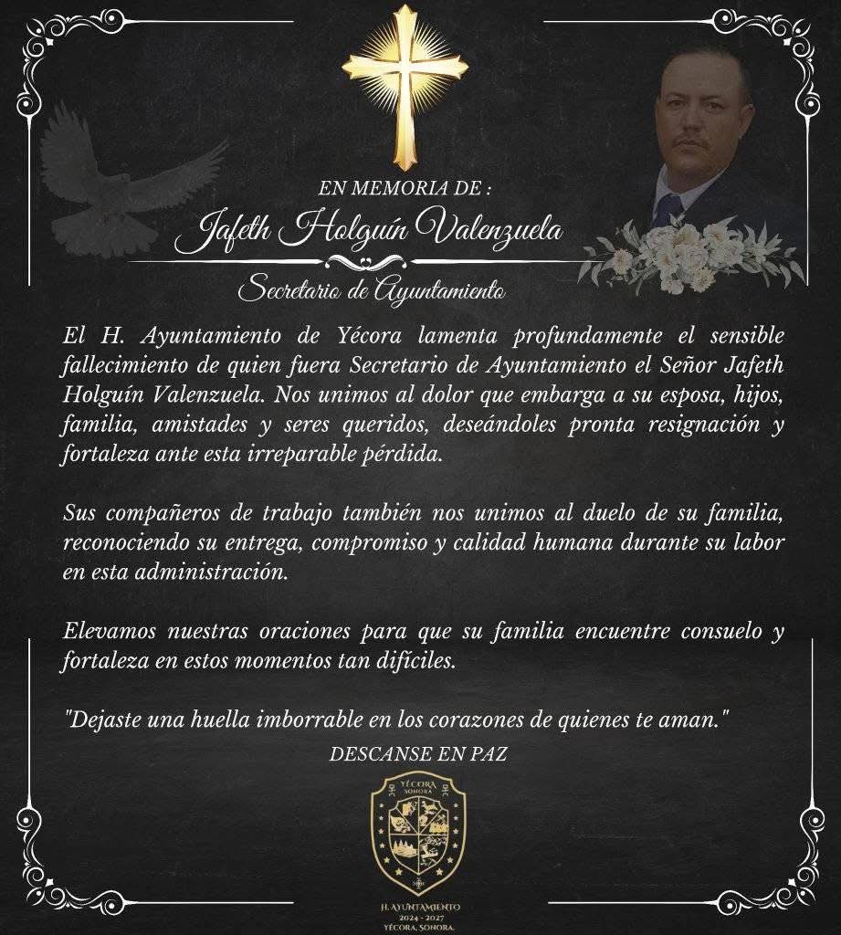 El Ayuntamiento de Yécora lamentó el asesinato del secretario Jafeth Holguín y externó sus condolencias a sus familiares y amigos.